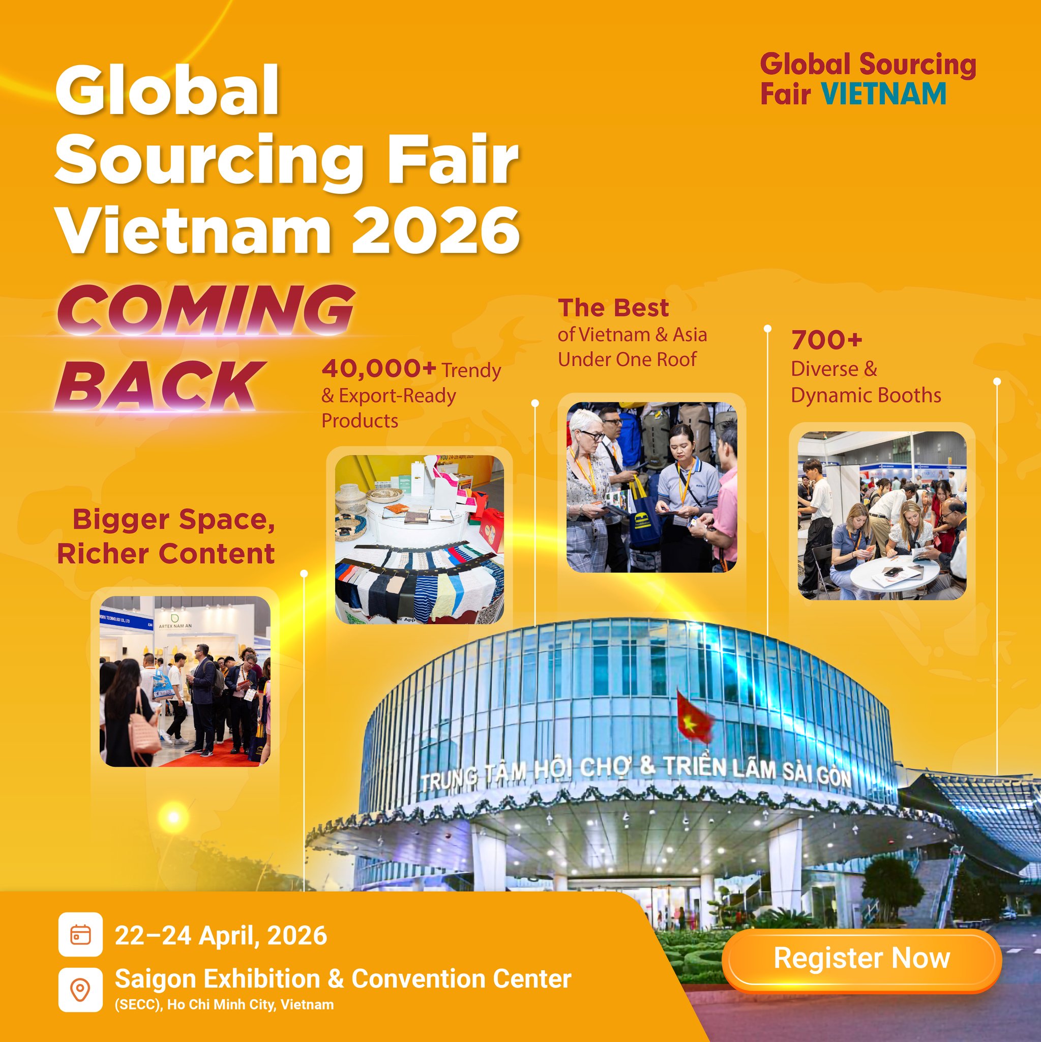 🔹 Không cần phải bay ra nước ngoài hay tốn nhiều chi phí tìm kiếm đối tác, Global Sourcing Fair Việt Nam 2026 mang đến cho doanh nghiệp cơ hội kết nối trực tiếp – hiệu quả – minh bạch ngay tại Việt Nam.